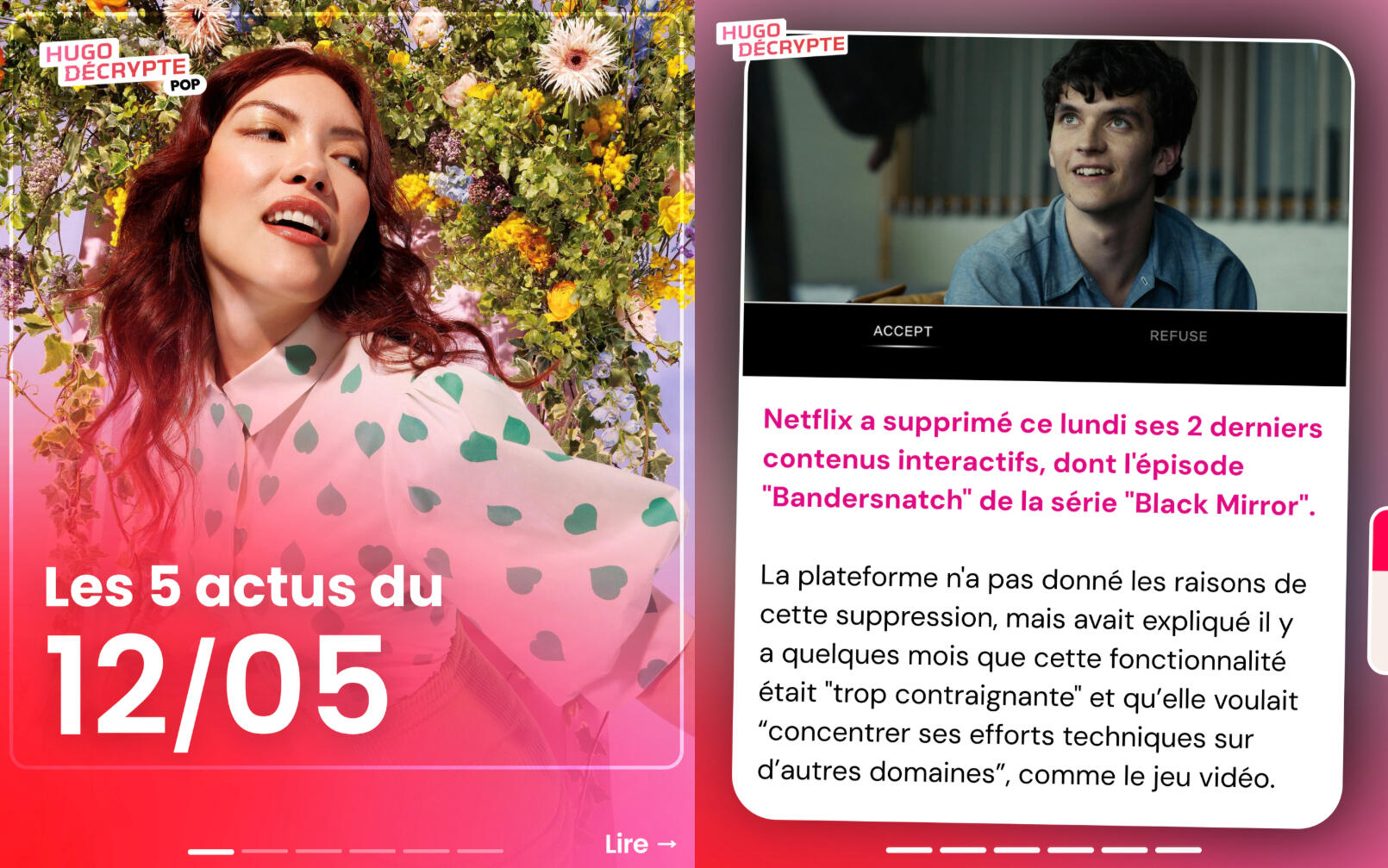 Après mon expérience à Spotters, j'ai rejoint l'équipe du média HugoDécrypte pour une alternance de 2 ans, de 2023 à 2025.Recrutée pour mon expertise en culture web, j'ai passé la majorité de mon temps sur les sujets culturels, notamment sur le compte Instagram hugodecrypte.pop (~1M d'abonnés). J'ai aussi pu régulièrement intervenir sur le reste des missions du média.Pour accéder aux liens des publications, vous pouvez cliquer sur les photos.